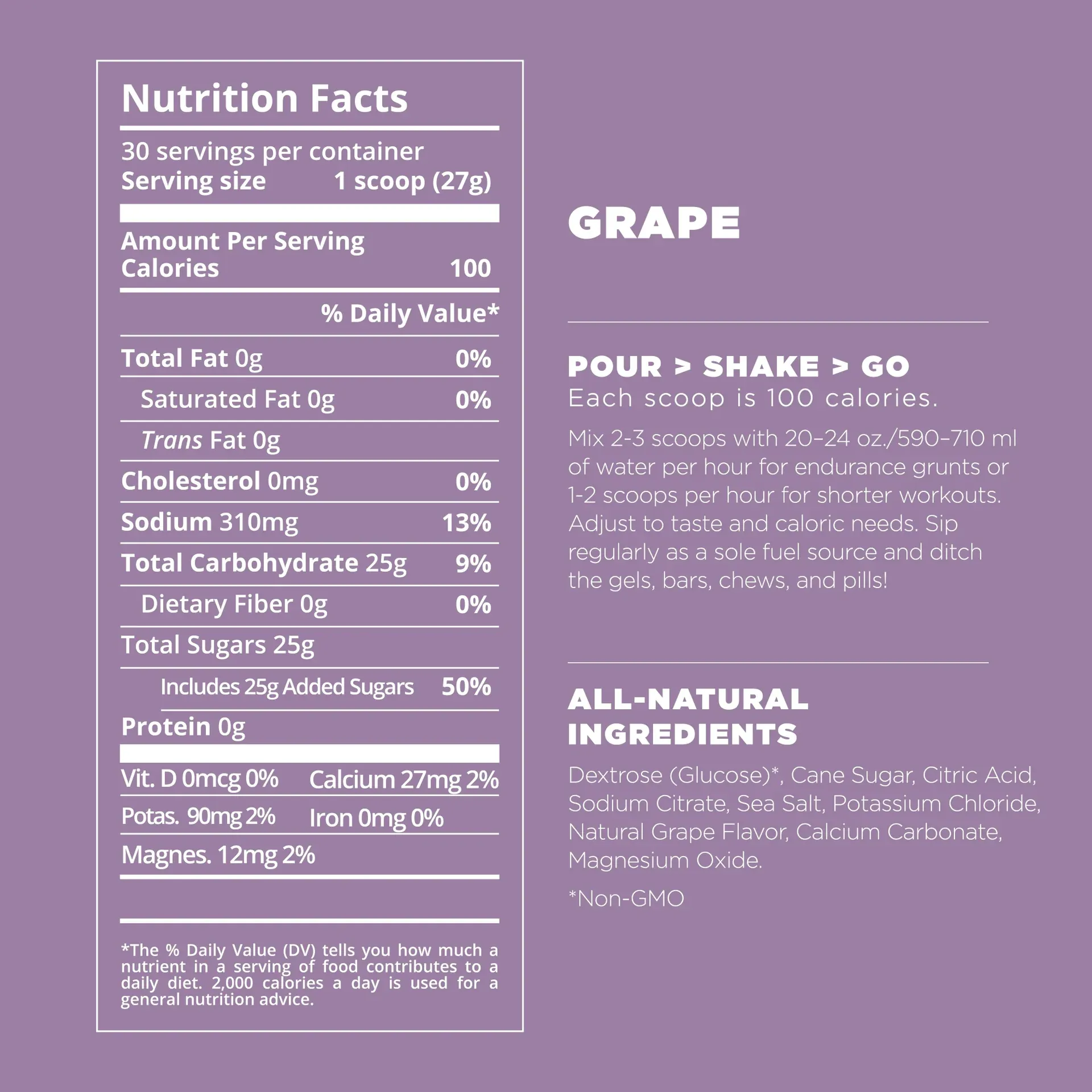 Non-GMO Dextrose (Glucose), Non-GMO Cane Sugar, Citric Acid, Sodium Citrate, Sea Salt, Potassium Chloride, Flavor, Calcium Carbonate, Organic Caffeine, Magnesium Oxide