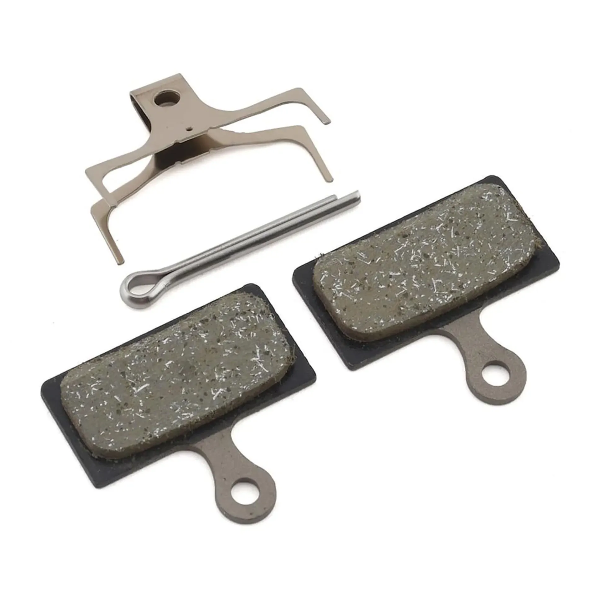 These disc brake pads include a pair of pads, a spring, and a cotter pin. They are designed for use with various Shimano braking systems.