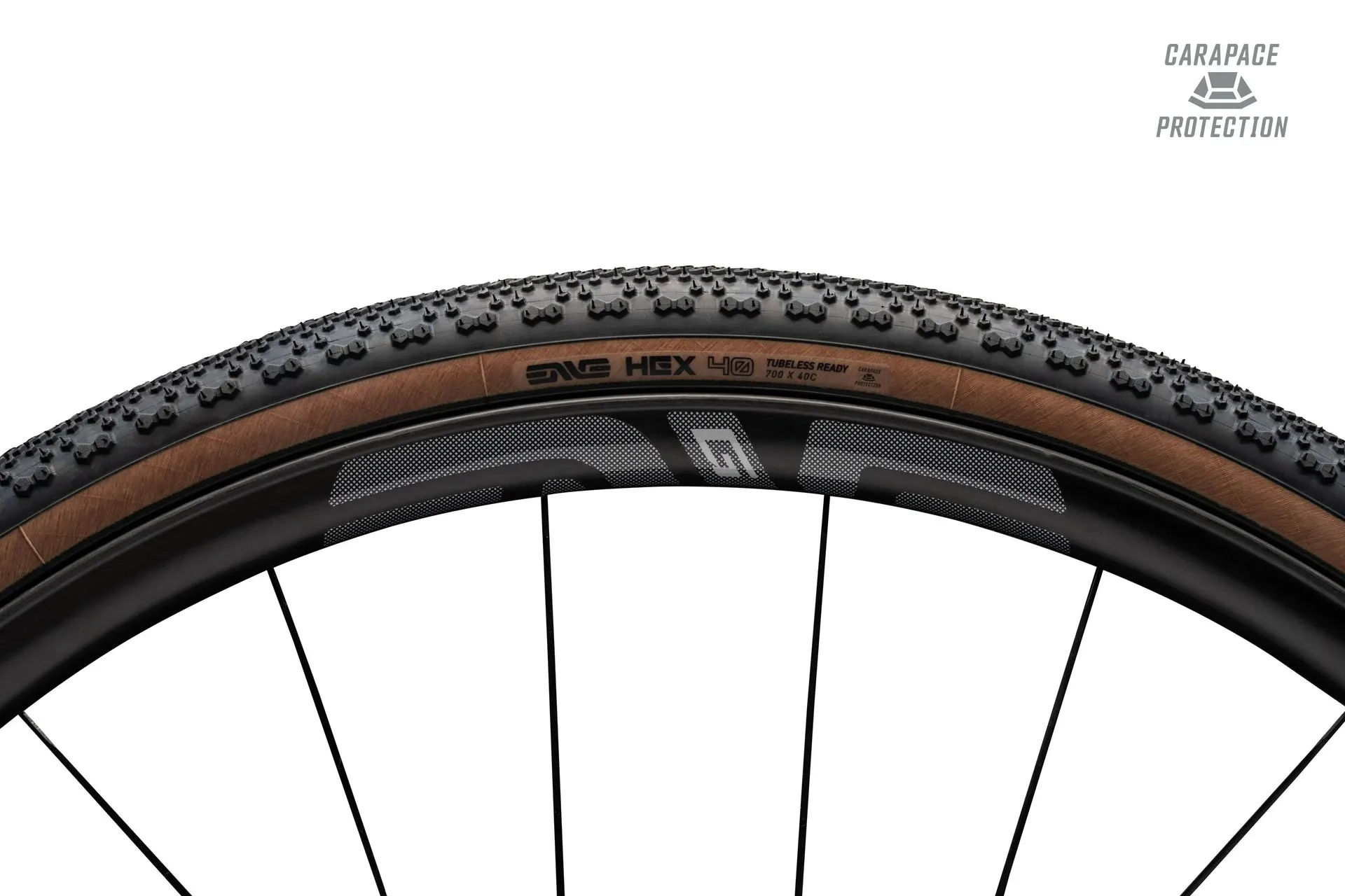 The Enve Composites HEX Carapace Gravel Tire is durable and adventure-ready, designed for hardpack, mixed, and loose conditions.